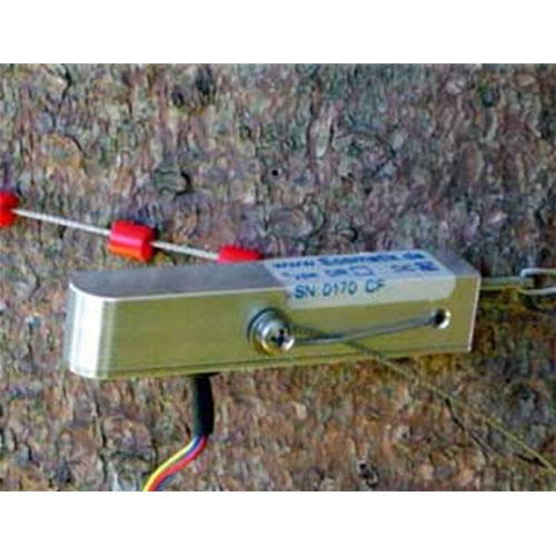 DC1是測量植物周長變化的簡單版本。傳感器通過一個(gè)由熱膨脹系數(shù)低的合金制成的鋼絲繩固定在樹上。用小塑料環(huán)減少鋼絲繩對樹的壓力,并減少摩擦阻力,大大提高靈敏度。